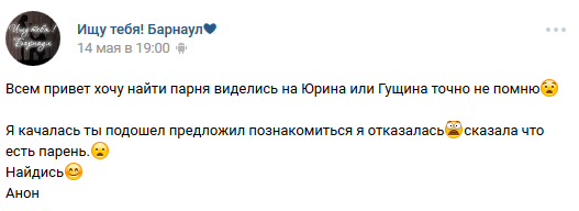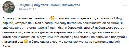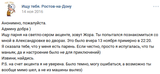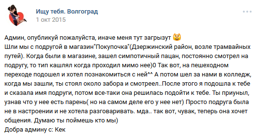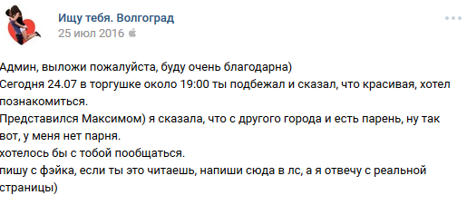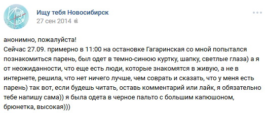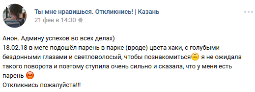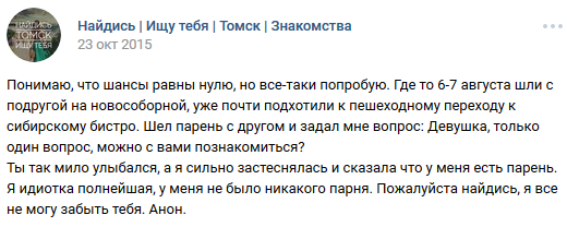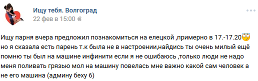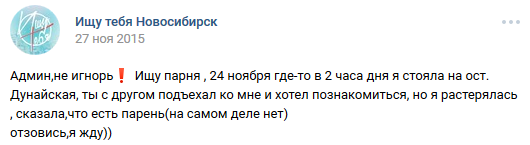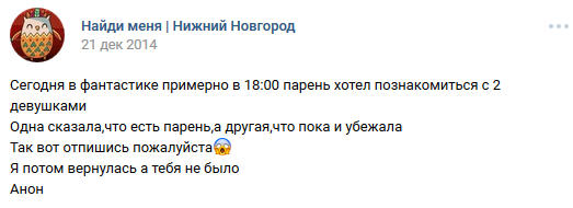 16 DELETED У меня есть парень (на самом деле нет) (длиннопост) 7 лет назад И после этого девушки возмущаются, что парни нерешительные, стеснительные, не подходят знакомиться с ним и т. д. [моё] ВКонтакте Скриншот Ищу тебя Трусость Длиннопост