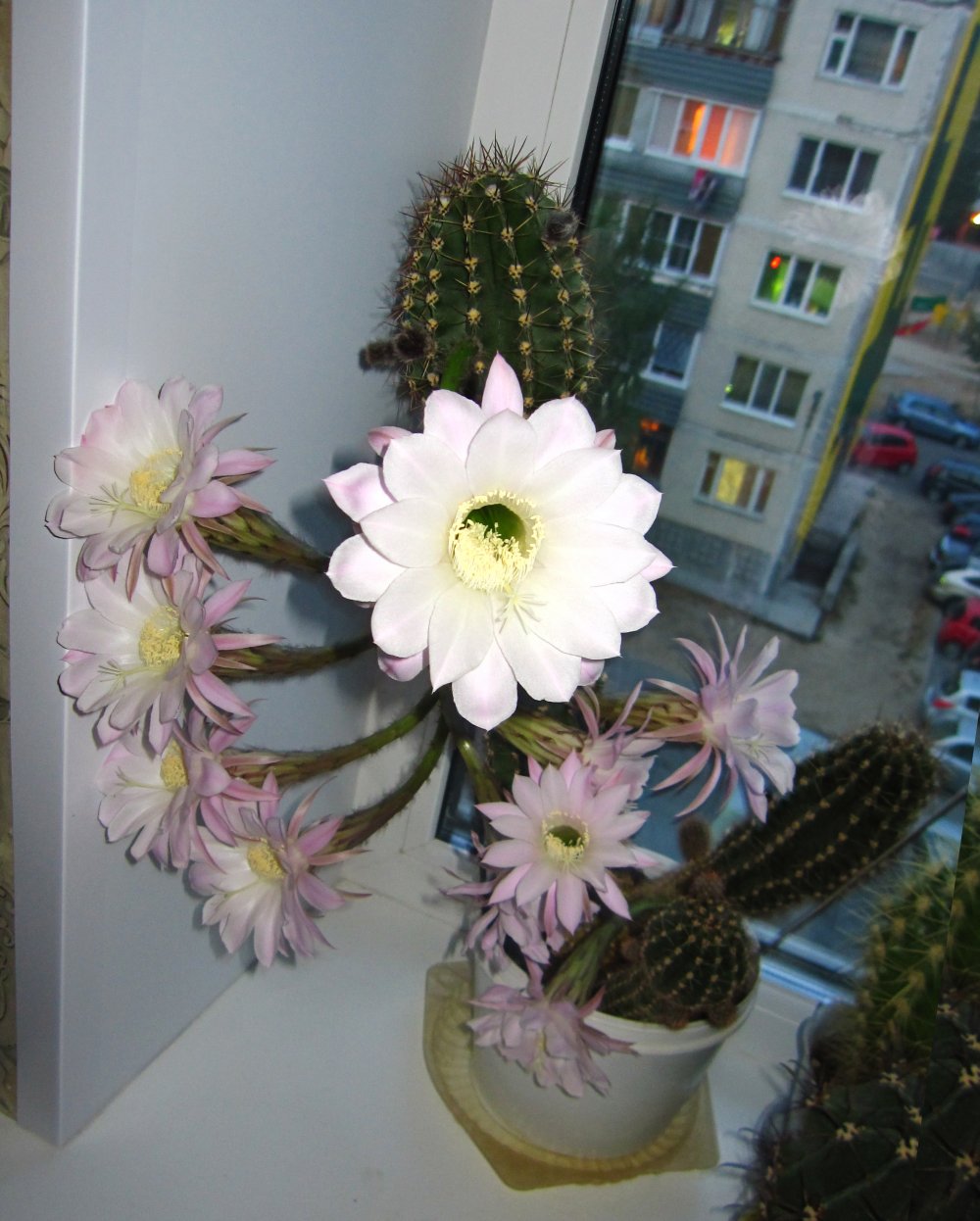 Собрались любители кактусов))) У меня тоже кактус есть но не цветет зато через пол года 50 см вверх вырос=))