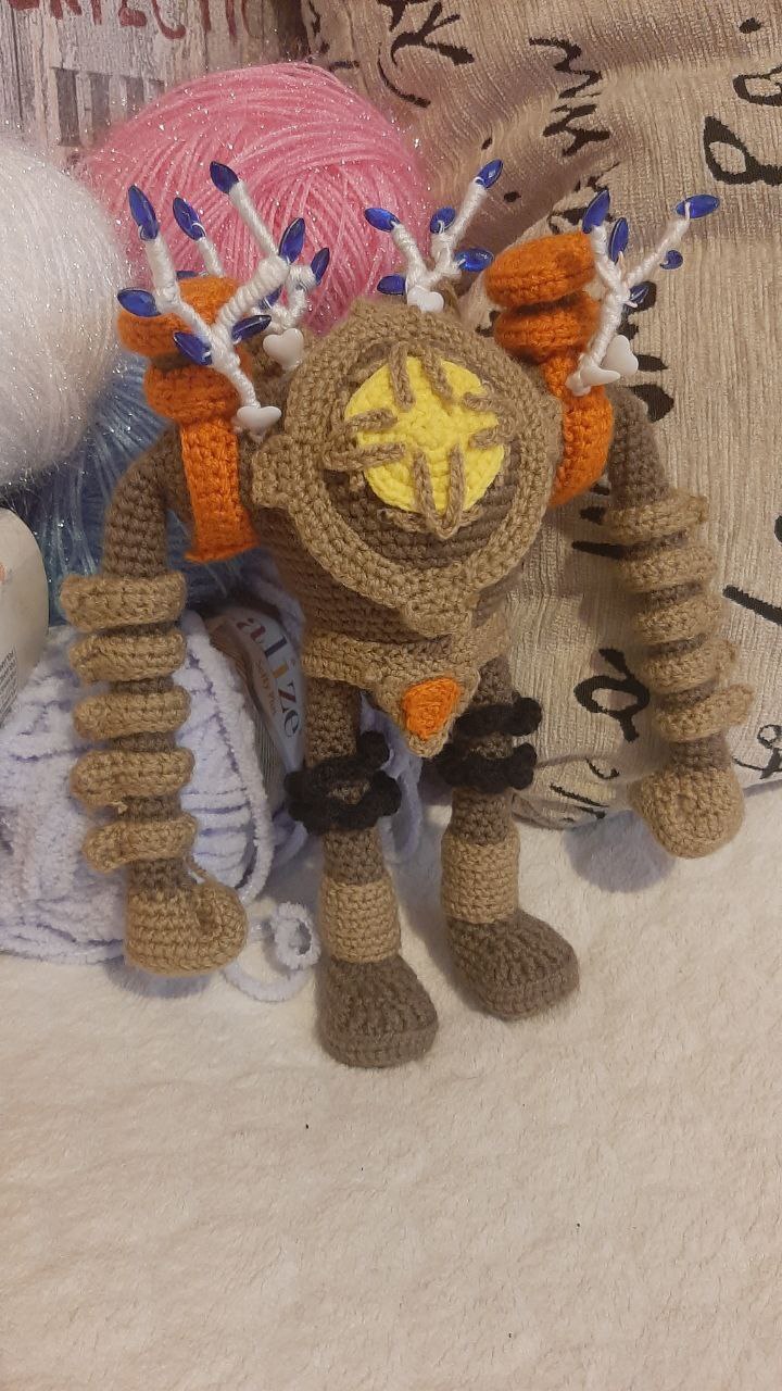 У меня снова заказали игрушку и безумно счастлива. На этот раз это персонаж из игры Genshin Impact - Страж руин. Вязала игрушку 3 недели, процесс был довольно сложным , но очень интересным. Вязала из акриловой пряжи, на проволочном каркасе, руки и ноги двигаются и сгибаются.