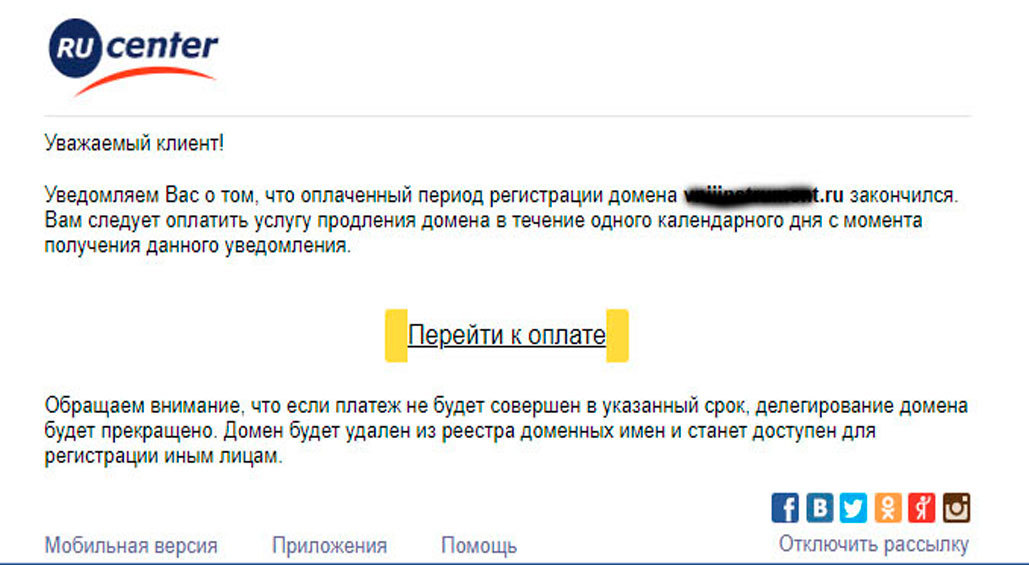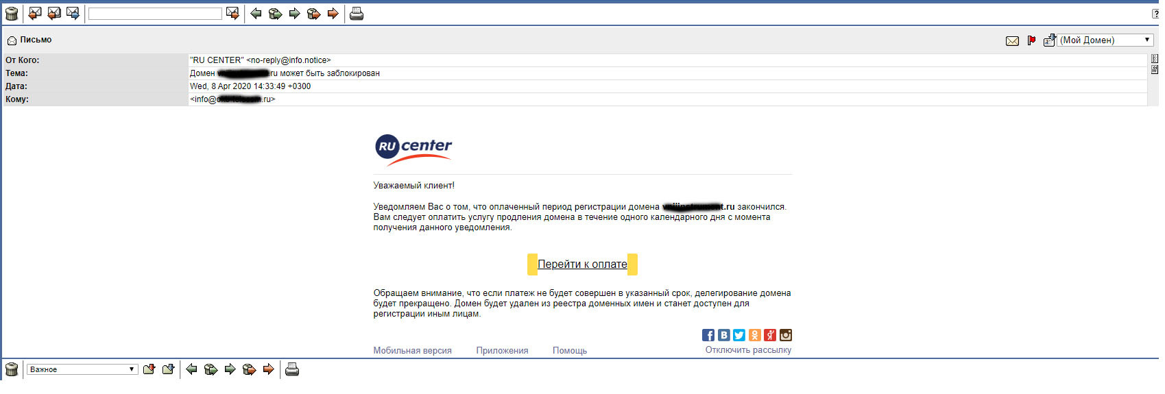Сегодня в инфо рассылку на работе пришло письмо от РУ Центра. Якобы домен, за который мы отвечаем просрочен с оплатой. Еще один день и кирдык вашему домену. Ссылочка на яндекс деньги - перейти к оплате. Манагеры наши тоже на удаленной работе, кстати, знают, что все должно быть нормально с доменами, но на всякий случай попросили проверить. Письмо явно левое, но все равно проверил на nic.ru, домен оплачен на год вперед. Будьте внимательны господа, мошенники тоже работают удаленно и выдумывают новые способы заработка. Всем удачи и не болейте.