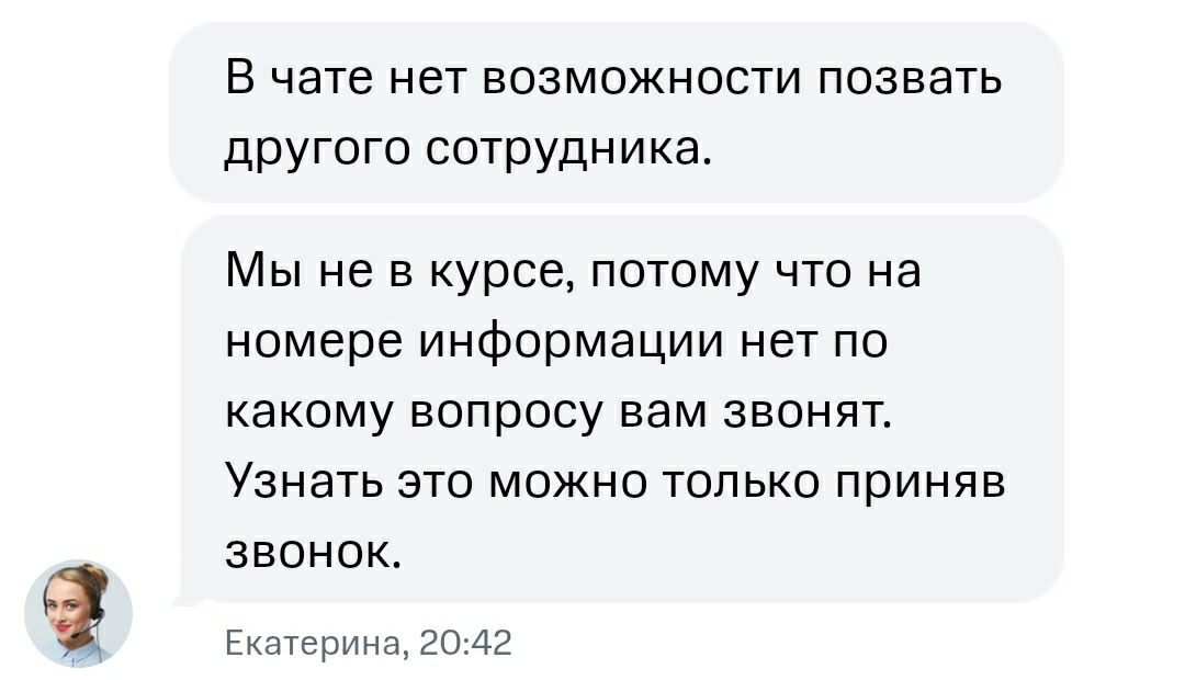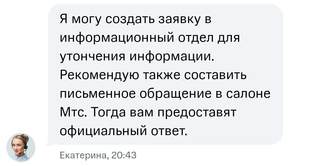 Наивно считая, что оператор Екатерина в 20:19 сообщила мне верную информацию о том, что это звонок с предложениями новых тарифных планов, а такой звонок я никогда не приму даже зная о его будущем содержании, я снова иду разбираться в чат с оператором. Вскоре получаю ответ: