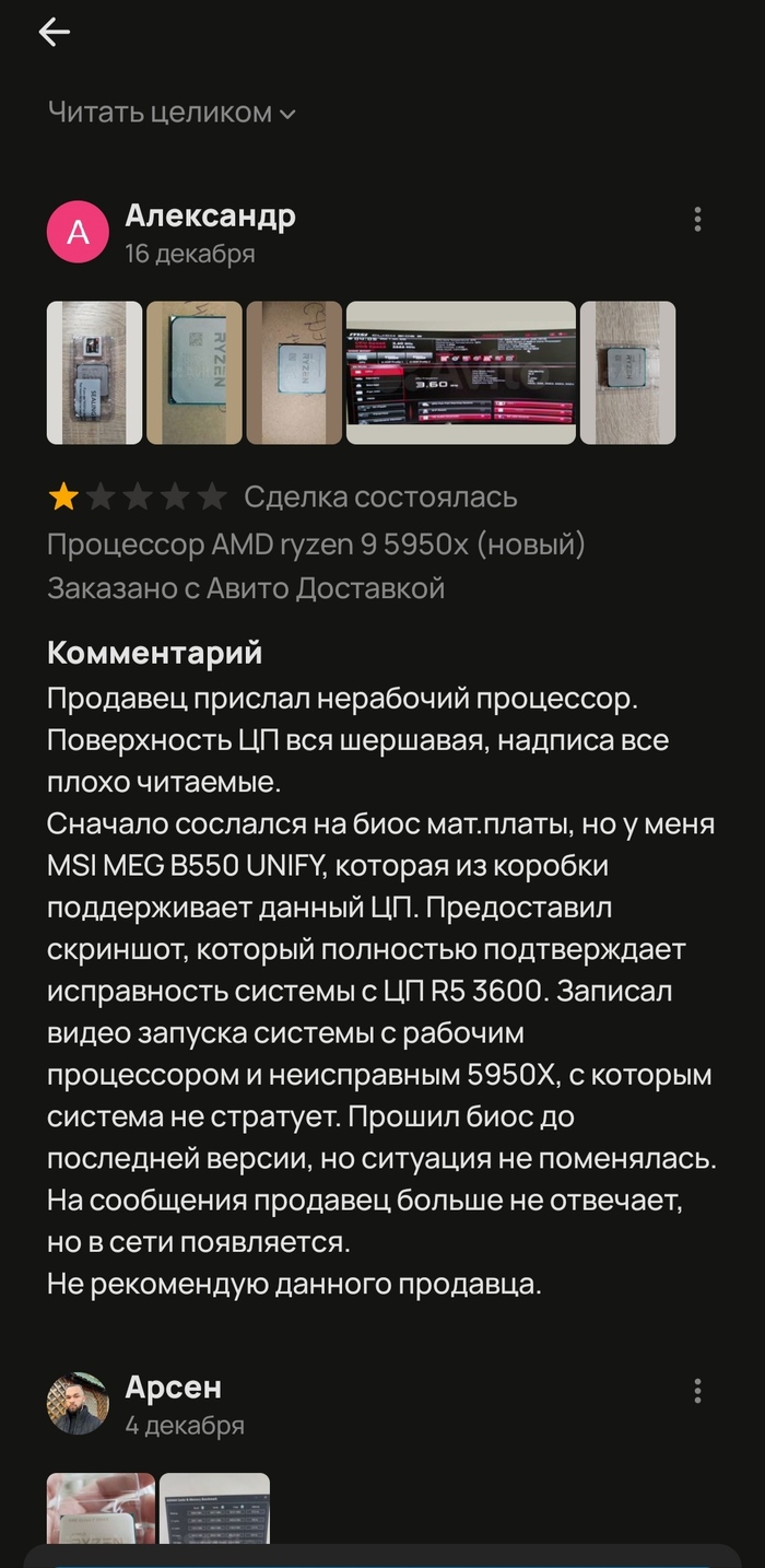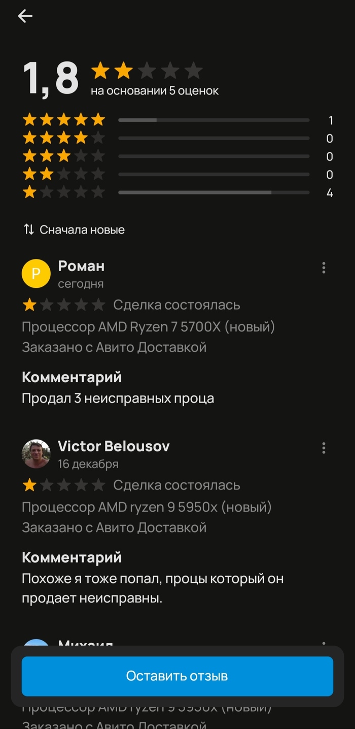 Так вот, после того как мошенник удалил свой профиль, спустя некоторое время на авито появился другой, в том же городе и с теми же процессорами. Поменялось имя, добавилось немного стороннего товара в ассортимент, для отвода глаз сгенерировано больше отзывов. Всё круто, никаких подозрений.