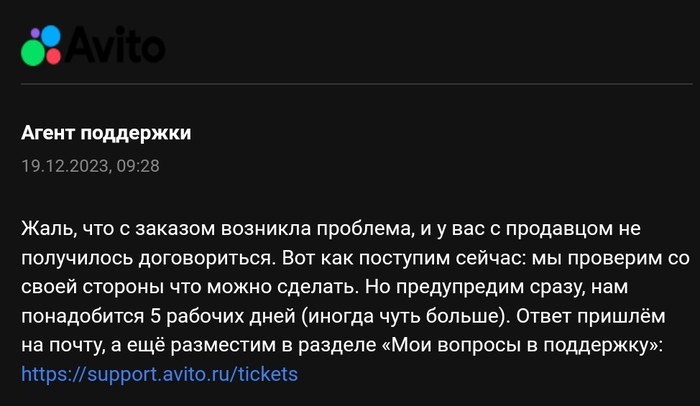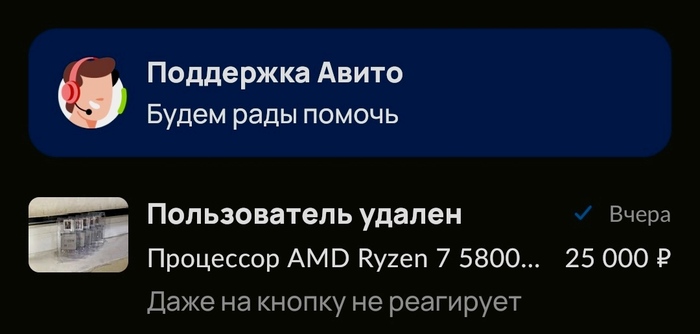 Такой расклад меня не устраивает и я пишу в поддержку ещё раз с куда более подробным описанием проблемы. Указываю, что профиль удалён, а обманут я оказался не один. Человек развёл на деньги сразу несколько людей и был таков. От такого случая поддержка отмахнуться уже не могла и мне пообещали разобраться с ситуацией и всё проверить. Конечно же я наивный поверил, что службе поддержки не всё равно и они действительно найдут способ найти злоумышленника с целью привлечь его к ответственности. Суммарный ущерб, я напомню, составлял более 100 000 рублей, один из покупателей сразу три процессора почти на 50 тысяч купил. Не самое, но всё же довольно крупное мошенничество.