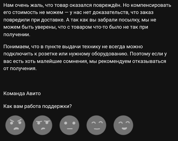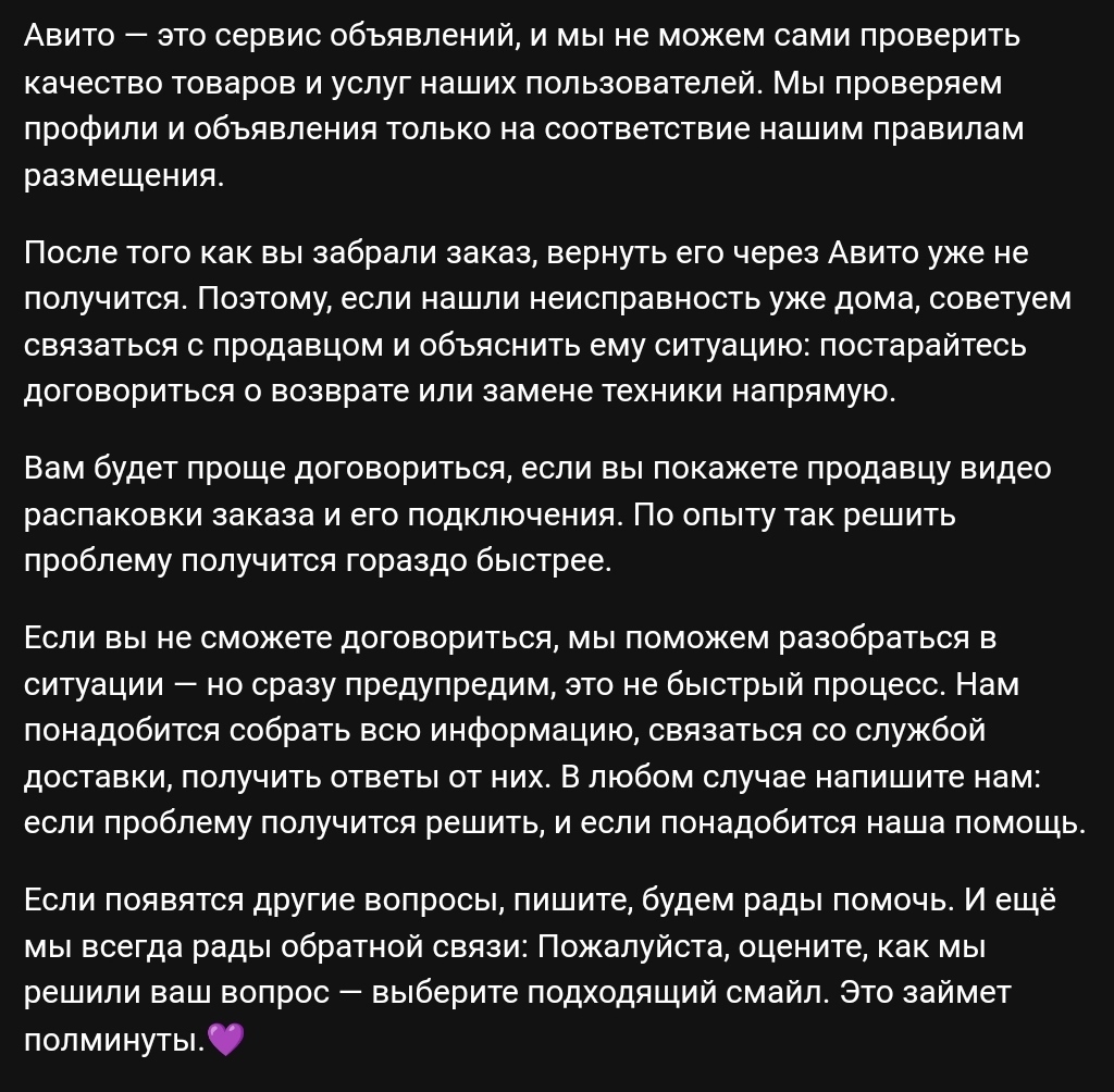 Сказано-сделано. Я написал в поддержку обращение о том, что мне прислали нерабочий товар и получил абсолютно классический ответ – напишите продавцу и договоритесь о возврате. Ну ок, напишу ещё раз, он меня снова проигнорит, а дальше что?