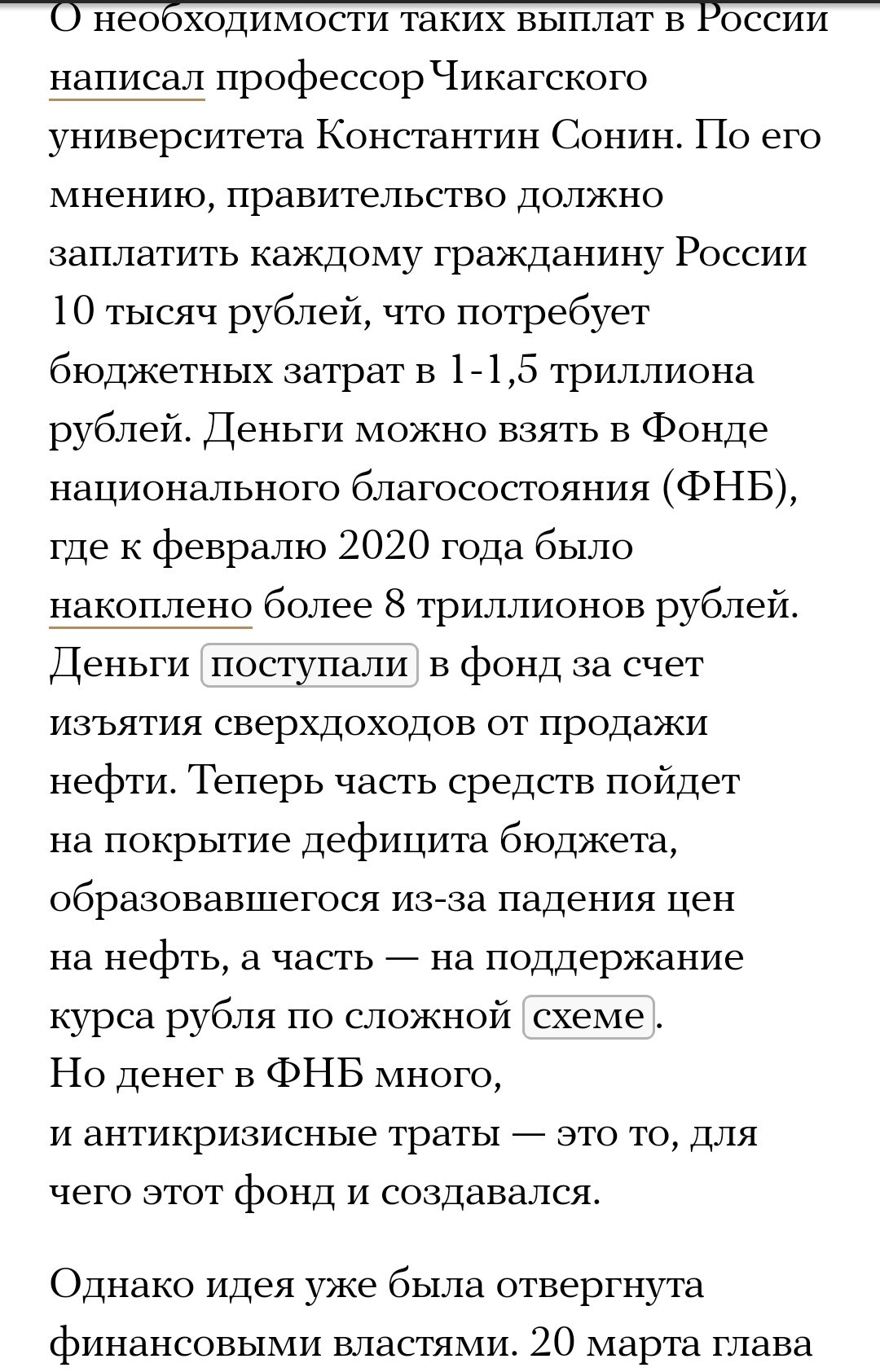 В связи с вирусом многие страны задумываются о реальной поддержки населения деньгами,даже в таких развитых как США.где уровень жизни в сравнении с той же Россией просто потолок.но наши власти даже не рассматривают такие варианты..люди и так шикуют последние годы,зарплаты растут,покупаются дорогие автомобили,недвижимость...