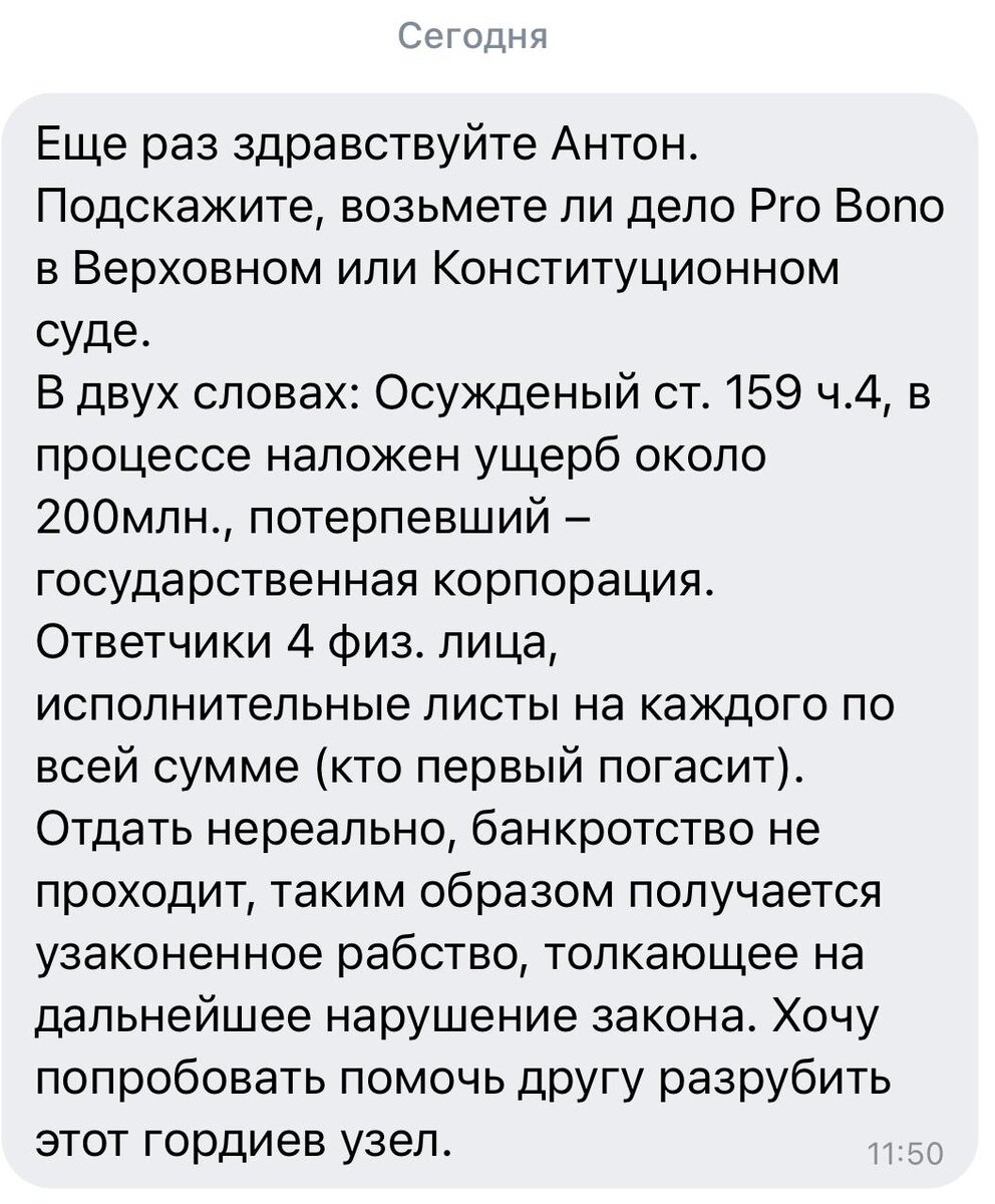 А теперь перевожу на русский язык предложение, с которым ко мне обратился гражданин хороший: имеются четыре осужденных, которые путем мошенничества свистнули у государства примерно 200 миллионов рублей. Три судебные инстанции - первую, апелляцию и кассацию - эти мошенники уже прошли, ущерб им подтвердили. Отдавать деньги страсть, как неохота (мне, признаться, тоже не хотелось бы, 200 миллионов, все-таки), поэтому не мог бы Антон Геннадьевич взять на себя совершенно бесплатно обязанность изучить это дело (в котором, как я думаю, томов под сотню будет), да и подготовить жалобу в одну из двух самых сложных судебных инстанций?