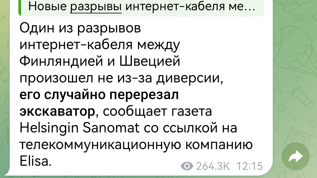 Кабель, соединяющий Швецию и Финляндию, был поврежден на территории последней. Около двух недель назад были оборваны два кабеля в Балтийском море — между Финляндией и ФРГ и между Швецией и Литвой.