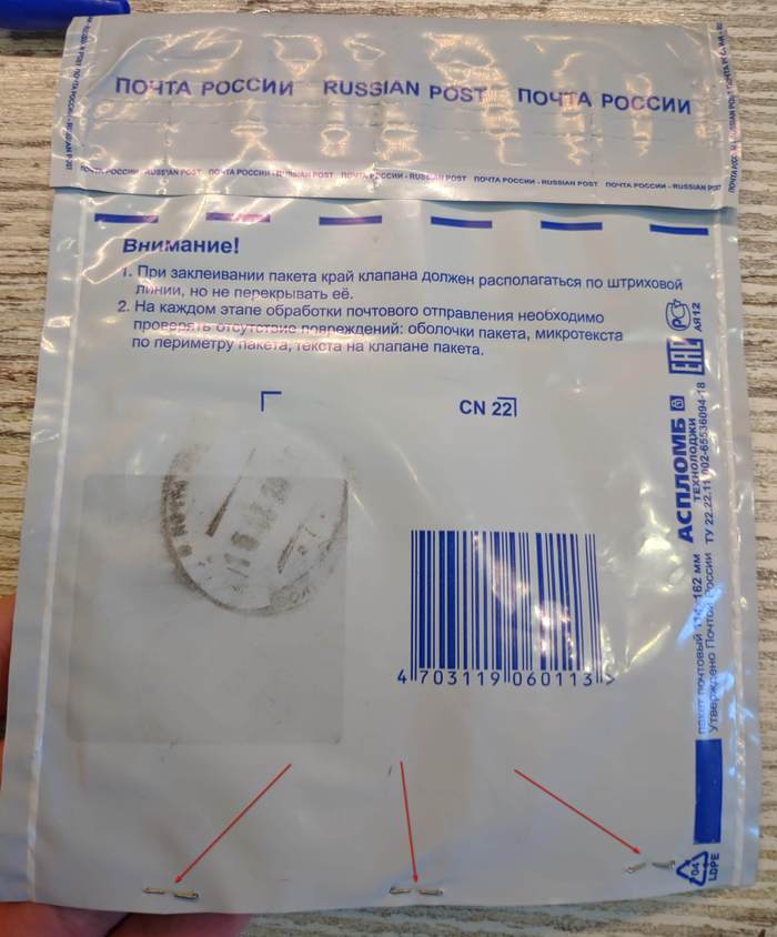 Родные отправили нам новогоднюю открытку в секьюрпакете от АСПЛОМБ, при получении из почтового ящика обнаружили, что пакет был вскрыт в поисках денег, а затем ничего не найдя в нём, аккуратно закрыли степлером. Написал в тех. поддержку Почты России, там сказали т.к. ничего не пропало то и расследовать нечего, могут максимум, что сделать сообщение о неудовлетворительной доставке. Зачем тогда секьюрпакеты придумали если их состояние не проверяется? Поднимите зарплаты чтоль, работникам почты россии, а то уже посылок с алика им мало.