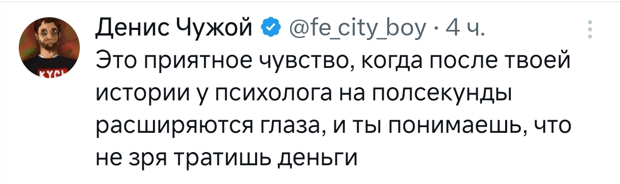 460 Dememtor Уголок Копипастера У психолога 10 месяцев назад Денис Чужой Скриншот X (Twitter) Психолог 24 2 2 Ещё 0