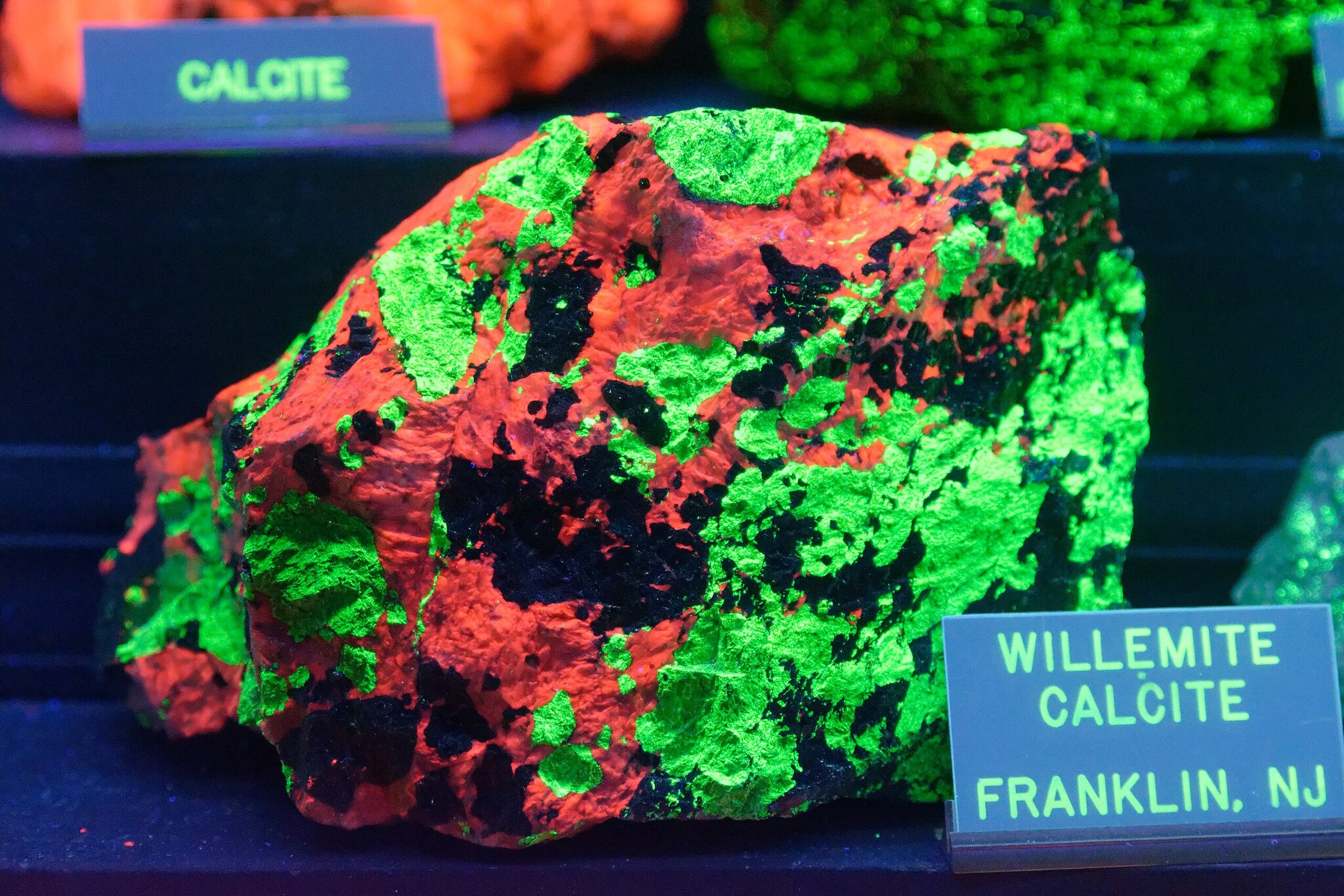Виллемит (зел.) с кальцитом (красн.) под ультрафиолетом. Месторождение Франклин, штат Нью-Джерси, США. Автор: Jud McCranie. Источник: https://commons.m.wikimedia.org/wiki/File:Willemite_calcite_...