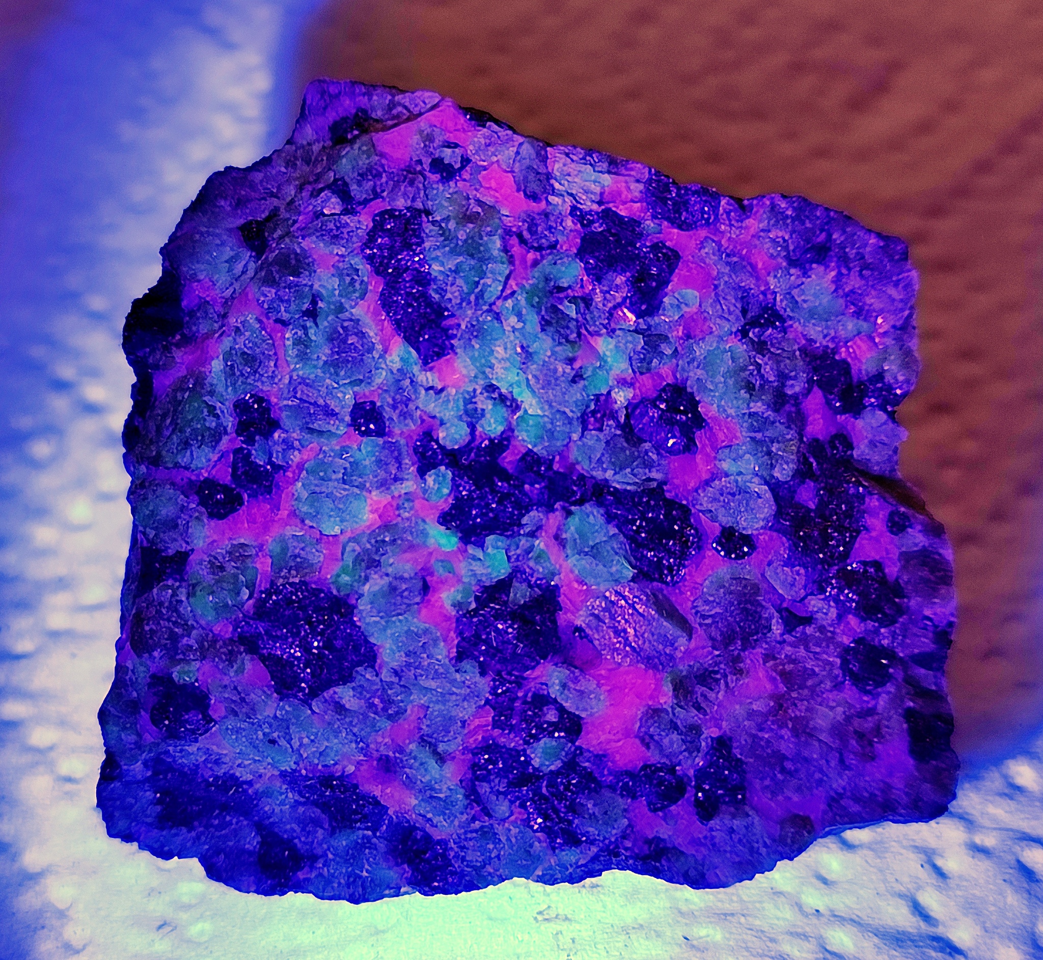 Здесь и на следующем снимке тот же самый образец при увеличении длины волны УФ-излучения (365-395 нм). Цвет флюоресценции виллемита становится потихоньку тускнее, зато кальцит начинает светиться розово-красным. Из собрания автора