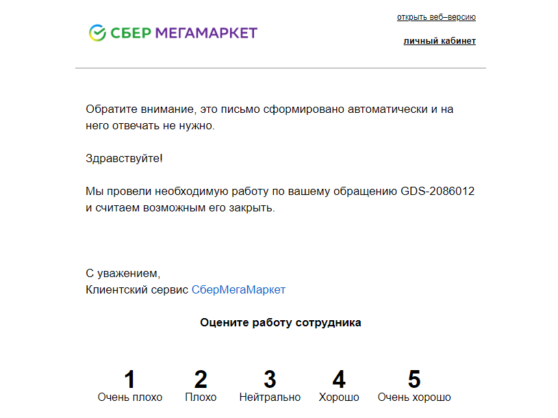 Ждать пришлось больше недели, в итоге получил на почту два письма. Причем первым пришло письмо с информацией о том, что мой запрос закрыли, и предложением оценить работу сотрудника. Сначала даже не понял, какую работу они просят оценить. Возможно то, что сотрудник написал письмо без ошибок.