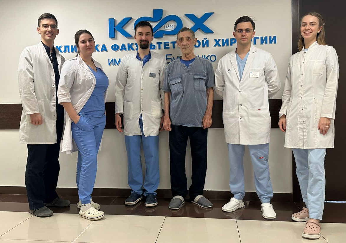 Слева направо - ординатор Максим Дмитриевич Булкин, хирург Мария Николаевна Пикуза, Юрий Евгеньевич Киценко (собственно, я), наш молодой герой 78 лет, хирург Ильдар Равильевич Билялов и ординатор Анастасия Андреевна Шальнева. Все, кто занимался лечением.