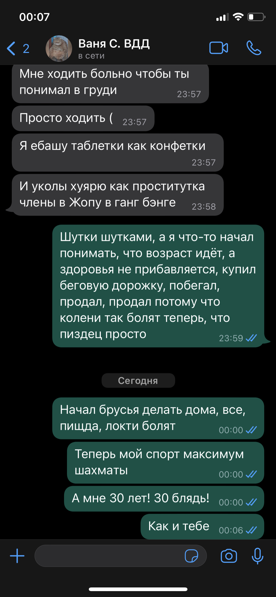 Ganoza 2 года назад У всех так после 30и? [моё] Скриншот 30 лет Боль Спорт Длиннопост Мат Переписка Ещё 0