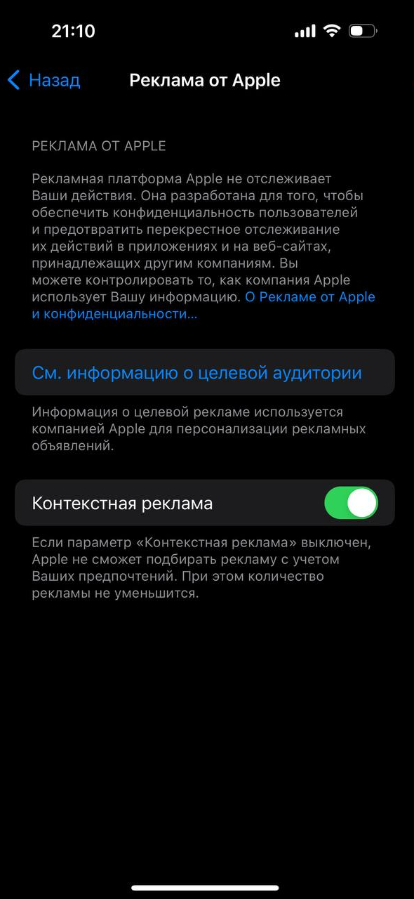 1. Настройки – конфиденциальность - реклама от Apple – отключаем ползунок Контекстная реклама.