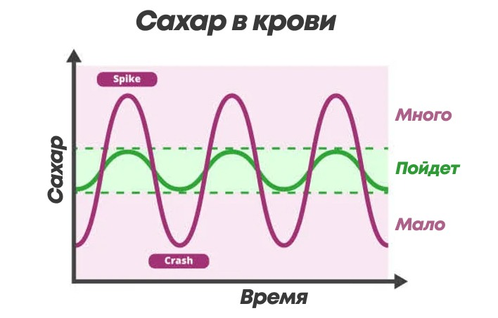 Когда любая пища попадает к нам в пустой желудок, то все процессы протекают сильно быстрее. Сахар поступает в кровоток тоже быстрее, что вызывает резкий скачок сахара в крови, за которым следует резкий спад.