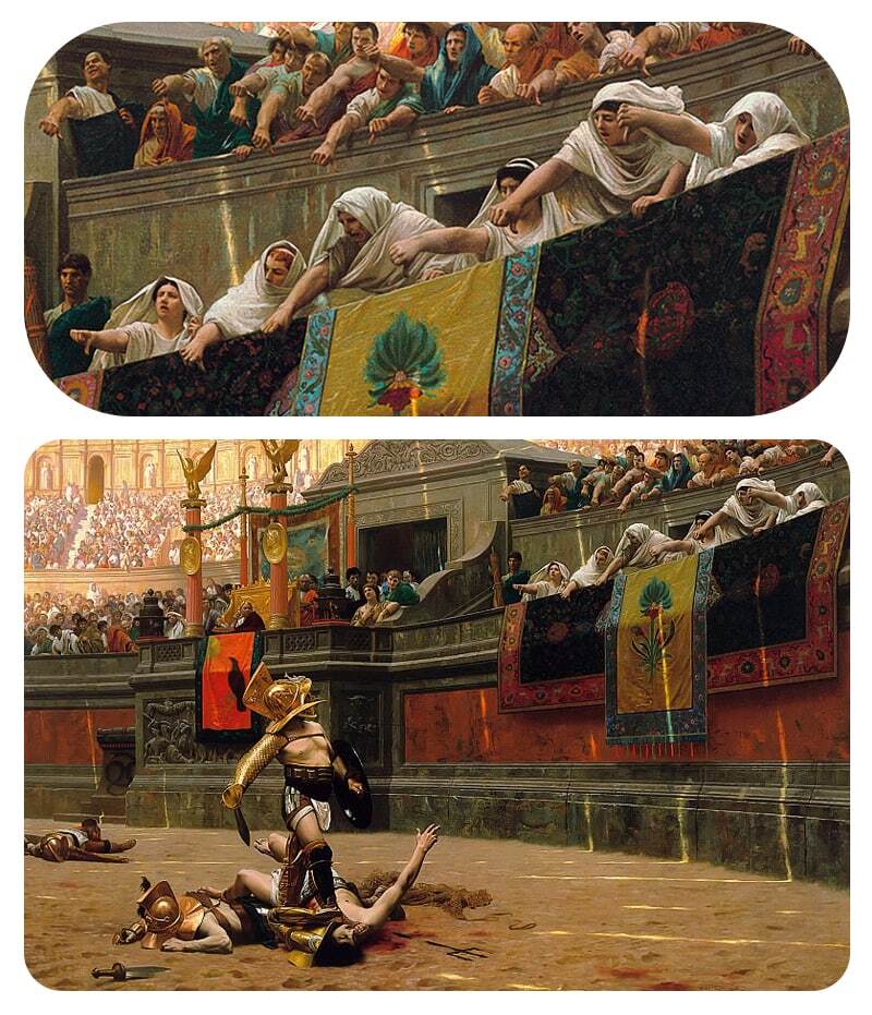 Это картина «Pollice Verso» французского художника Жана-Леона Жерома (1872). Она иллюстрирует гладиаторский поединок и психологию толпы. Именно Жером популяризовал знаменитый жест «смерть для побежденного». Но фишка в том, что художник проебался и неправильно истолковал латинские исходники. Дело в том, что если толпа хотела смерти – она отгибала большой палец в любом направлении (и так 👍 и так 👎). Этот знак символизирует обнаженный меч. А если зрители хотели пощадить человека – они намекали на меч, спрятанный в ножны, и показывали сжатый кулак ✊