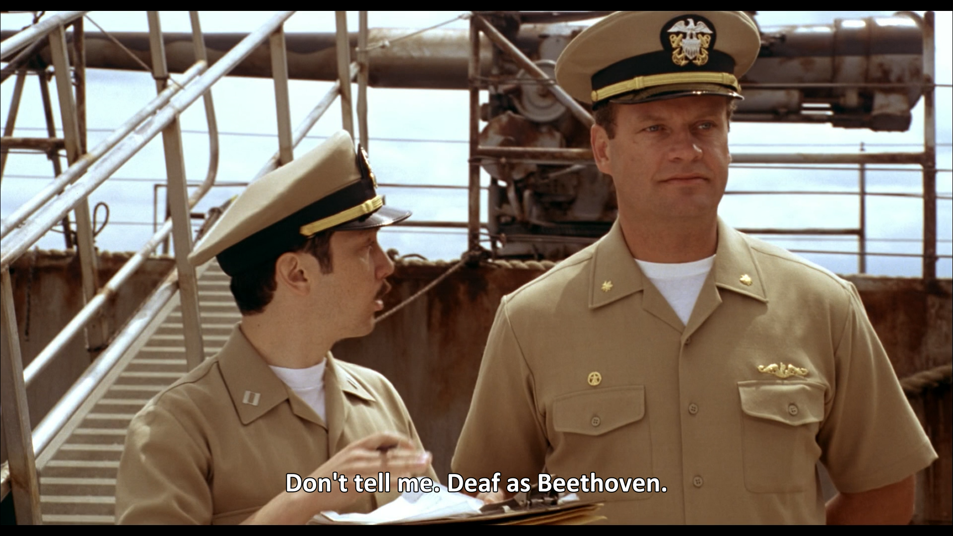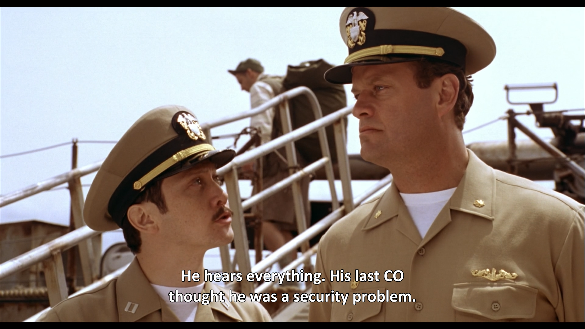 12)- Oh, no. Great ears, sir. Watch what you say around him. He hears everything. His last C.O. thought he was a security problem.