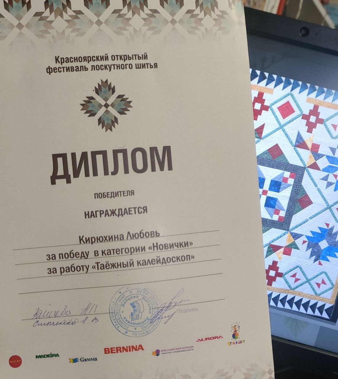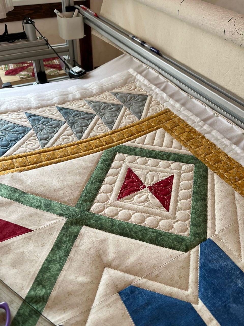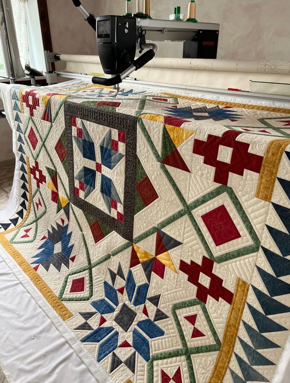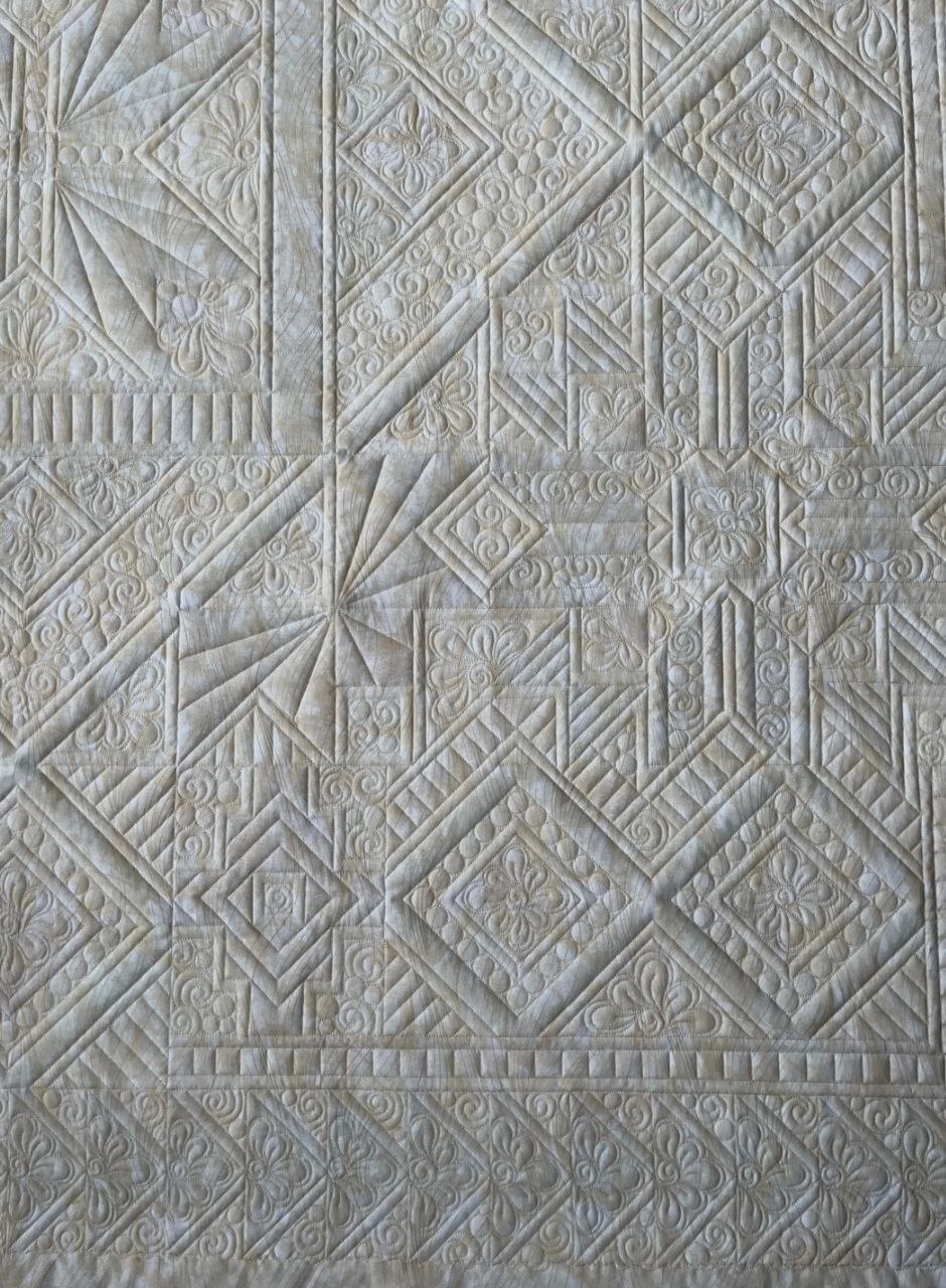А потом самый волшебный этап - стежка. Это действительно магия в руках мастера (стегала не я, у меня такой большой машины нет пока и навык стежки небольшой, поэтому стежку заказывала (правилами фестиваля это допускалось)).