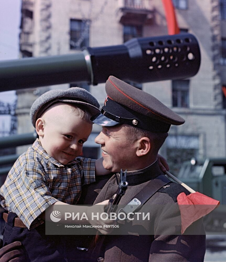 Сын рабочего машиностроительного завода Сережа Николаев на руках у командира артиллерийского расчета гвардейского соединения сержанта Романа Громова.