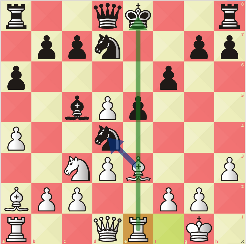 14... Крf8 - черные вынуждены отойти королем с опасной для них линии е, 15. Ке4 - белые усиливают давление и высвобождают поля для движения пешки с. И оказывается, что у коня нет хорошего поля для отхода.