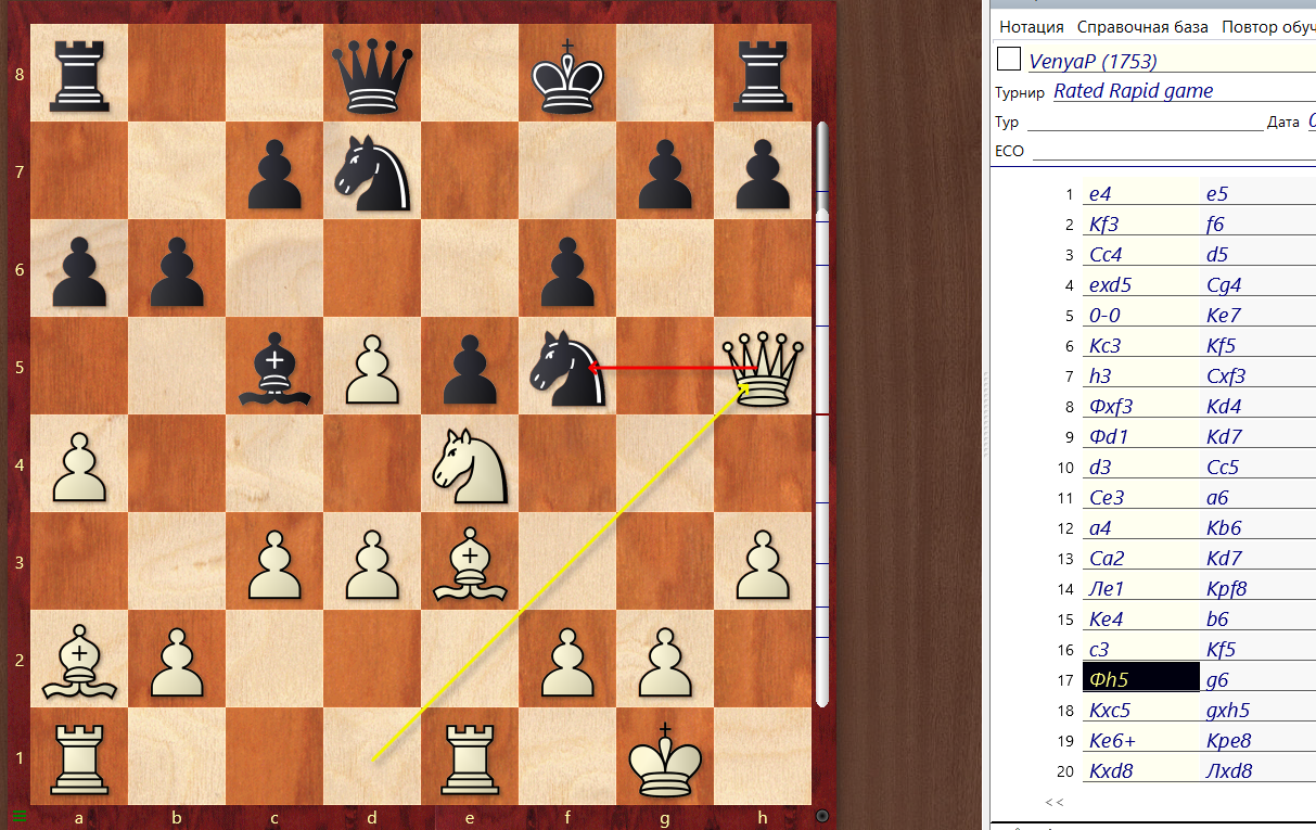 Но как видно по позиции ,все таки вариант с 16... Кf5 был лучше, т.к. 16...f5 - и после 16. схd4 - черные теряют фигуру и соперник сдался.