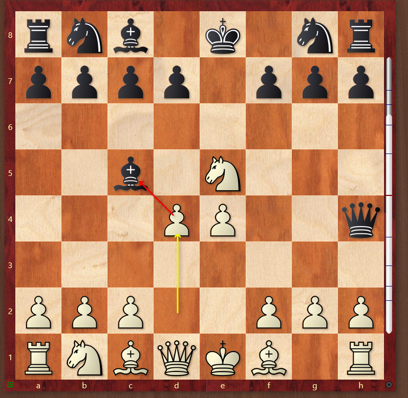 Белые развиваются с темпами, постоянно нападая на ферзя, выводя все (!) свои легкие фигуры, готовя рокировку, в то время как ферзь черных вынужден бегать от клетки к клетке, чтобы его не забрали.