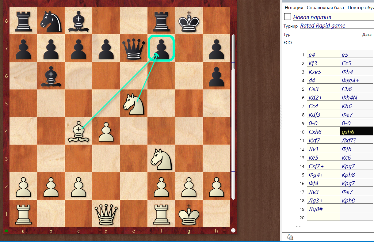 ... 10. Схh6 - взятие коня 10... gh - и конечно же жертва коня 11. Кf7 - хочу сразу предупредить любителей и начинающих, каждая жертва должна быть полностью просчитана с учетом, что соперник будет делать самый сильный ход, но именно ваша жертва несмотря на сильнейшие ходы соперника все равно приводит к победному результату. Если в ваших расчетах подобного нет и/или вы надеетесь ,что соперник будет делать только те ходы, которые вы от него ждете или у него есть такой ход, который полностью перечеркивает выгоды от отданной фигуры - но вдруг он его не заметит, то откажитесь от жертвы и ищите другие варианты ходов. Ведь если вы видите сильнейшие ходы соперника, то и соперник их обязательно увидит... А вот если в совершении ходов соперник допустит ошибку, то вы выиграете просто быстрее. Я не думал, что соперник возьмет коня 11... Лf7 - я считал что последует 11... Кс6 попытка развития и на двойной шах, он спрячет короля в угол на h8 и попробует как-то начать оборонятся, но взятие последовало