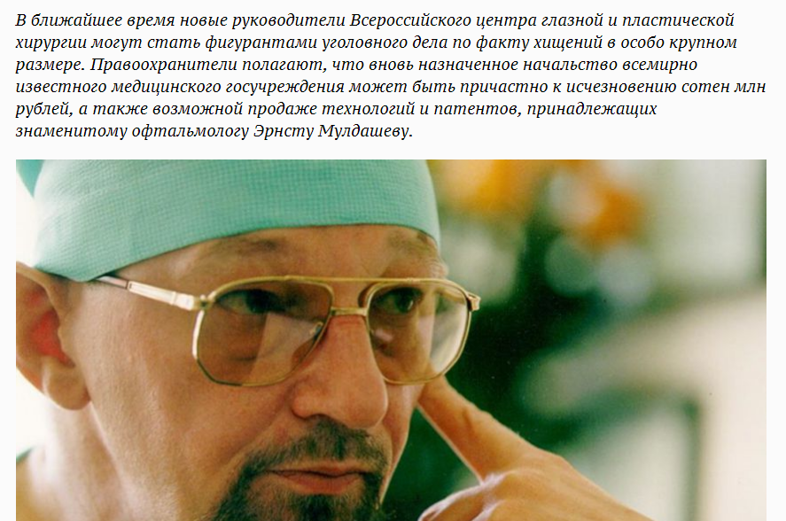 "Несмотря на то, что прославленный доктор Мулдашев до сих пор числится президентом Всероссийского центра глазной и пластической хирургии, «благодарные» ученики в буквальном смысле связали профессора по рукам. В клинике даже издали документ, который запрещает Эрнсту Рифгатовичу «вмешиваться в кадровую, финансовую, административно-управленческую и хозяйственную деятельность». Кроме того, профессор Мулдашев, оказывается, не может «ставить под сомнение распоряжения и приказы», выносимые в центре, а также рассказывать о происходящем журналистам. Надо ли говорить, что этот незаконный циркуляр нарушает все нормы о правах человека и, в том числе, и Конституцию России, позволяющую каждому жителю страны иметь свое мнение и суждение!