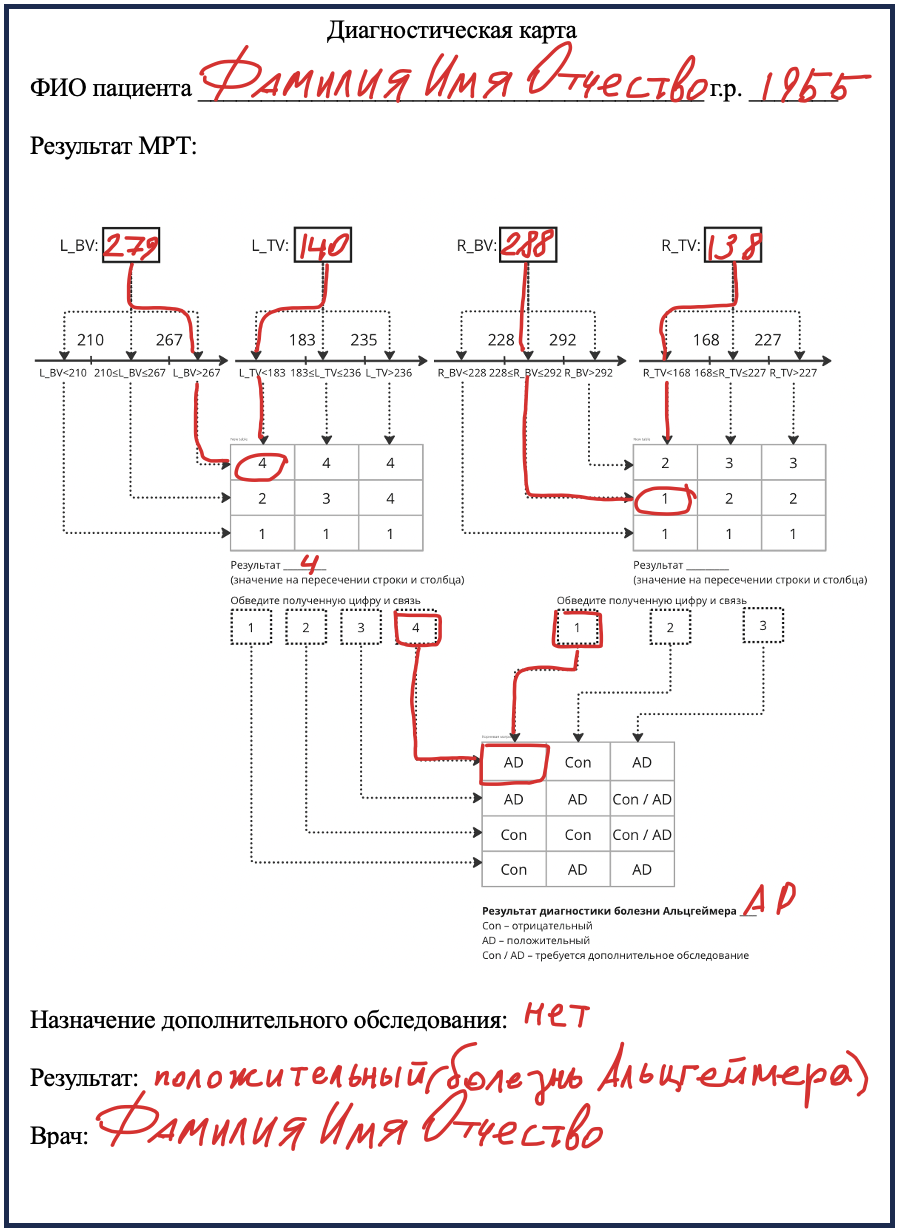 Далее с информацией о магнитной восприимчивости используются функциональные зависимости и с помощью специальных алгоритмов определяется корень принятия решений. Это математический объект, который связывает большой объем данных и сводит их к нескольким значениям. В изобретенном способе они принимают три возможных варианта: CON (control) – человек не болен, AD (Alzheimer's disease), то есть присутствует болезнь Альцгеймера, и CON/AD, что соответствует неопределенности. В третьем случае пациенту необходимо дополнительное обследование с помощью других известных способов.