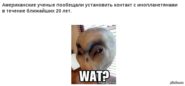 mrGhost Ученые пообещали установить контакт с инопланетянами 11 лет назад По радио услышал что ученые пообещали установить контакт с инопланетянами в течение ближайших 20 лет. В голове нарисовалась такая картинка: НЛО Пришельцы Ученые Wat Wat?