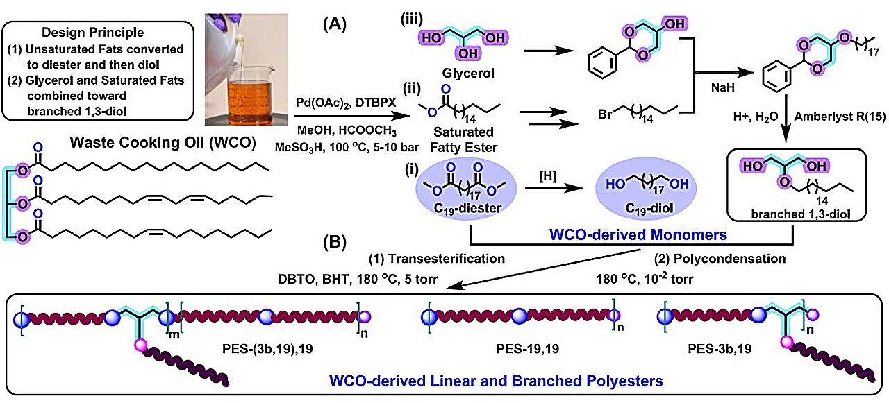 Отработанное растительное масло оказалось привлекательным сырьем: ежегодно в мире производят около 3,7 миллиарда галлонов этого вещества, и оно представляет собой богатый источник ненасыщенных жирных кислот. В эксперименте ученые сначала преобразовали эти кислоты в длинноцепочечный диэфир C19 с помощью палладиевого катализатора, затем восстановили его до диола. Глицерин из масла превратили в разветвленные 1,3-диолы. Полимеризация этих блоков привела к созданию серии полиэфиров (P1–P7), имитирующих свойства полиэтилена низкой плотности, иногда даже превзошедшего его в эластичности и прочности.