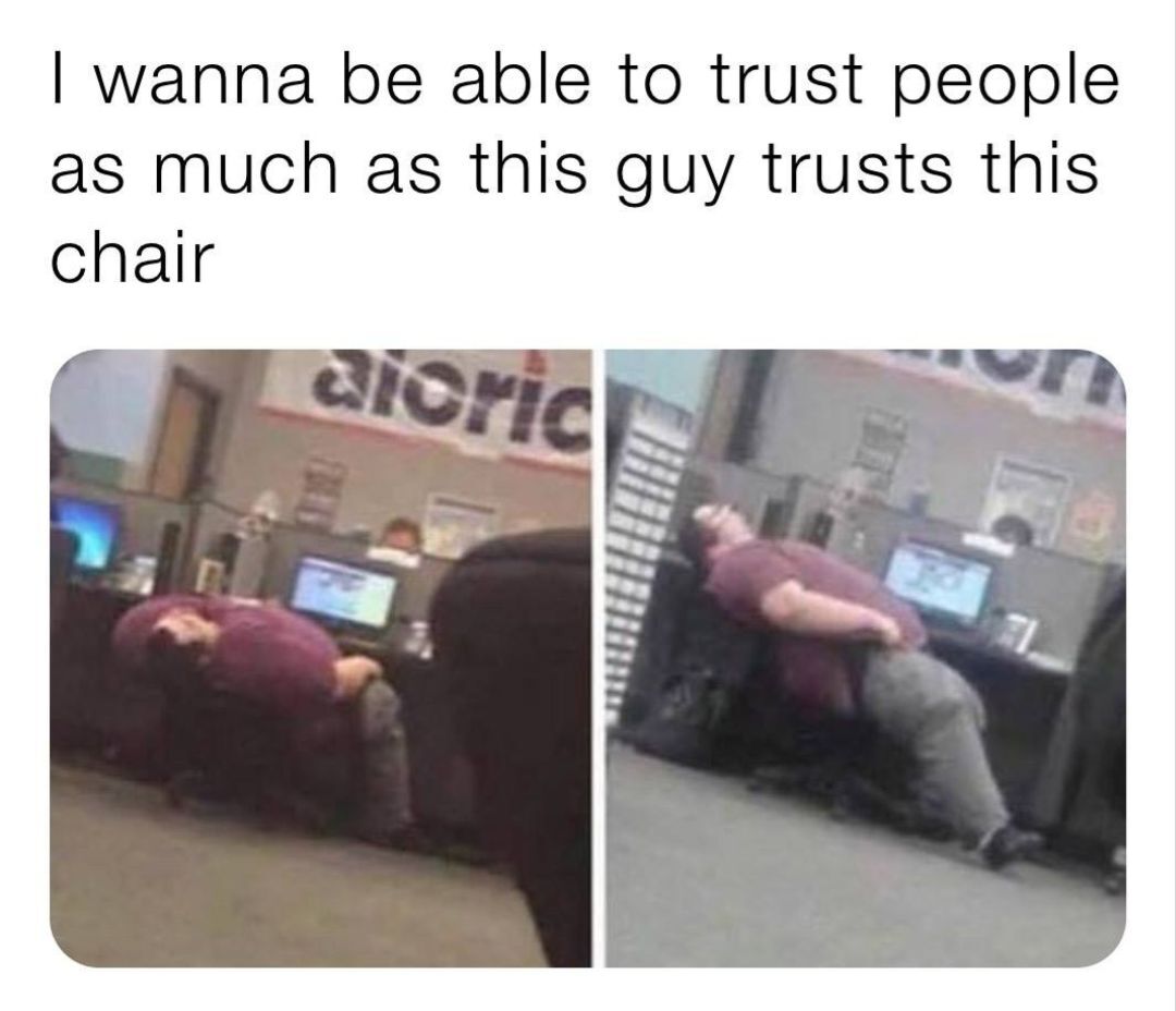 Я хочу быть способным доверять людям так же сильно, как этот парень доверяет этому стулу