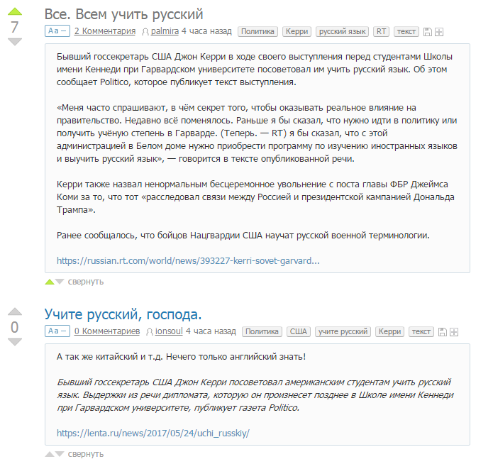 Бывший госсекретарь США Джон Керри посоветовал американским студентам учить русский язык. Выдержки из речи дипломата, которую он произнесет позднее в Школе имени Кеннеди при Гарвардском университете, публикует газета Politico.