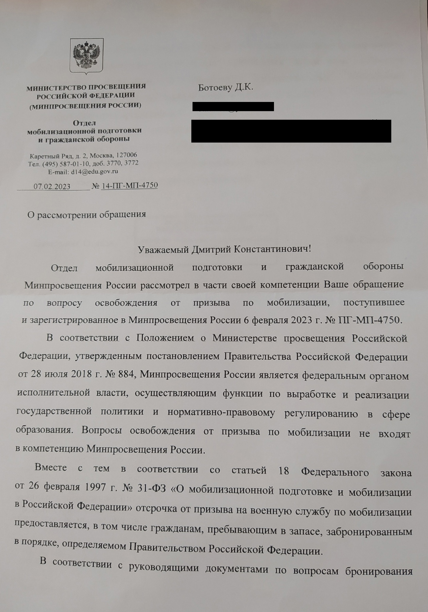 Недолго думая, направил вопрос в Министерство просвещения РФ. В письме изложил свою позицию об участии учителя в военных действиях.