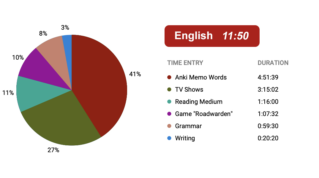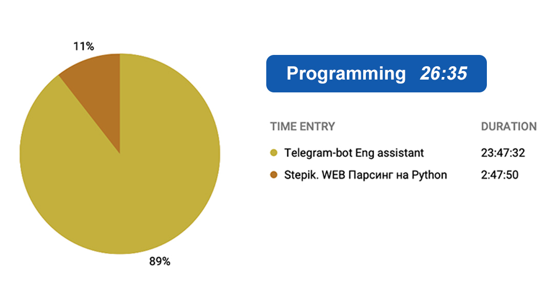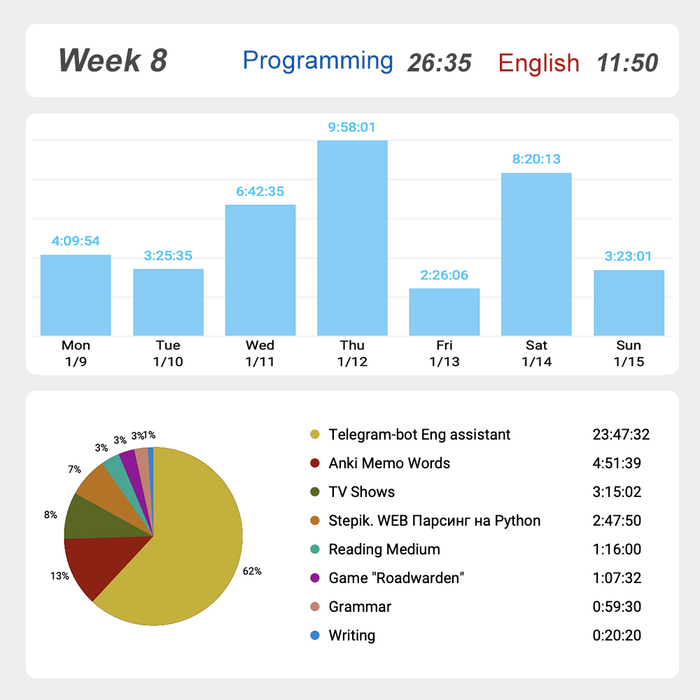 Я начал трекать время, потому что прогресс от учебы сложно отследить на малой дистанции. Уже 8-ая неделя, почти 2 месяца прошло со старта. И это достаточная дистанция чтобы почувствовать качественный прогресс.