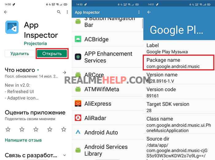Прежде всего, включаем на смартфоне отладку по USB, как в предыдущем варианте. С Google Play скачиваем софт App Inspector. Запускаем его и видим список всех приложений, установленных на мобильном устройстве. Открываем программу, которую хотим удалить, и обращаем внимание на строку «Package name». Копируем ее и вставляем в блокнот на компьютере.