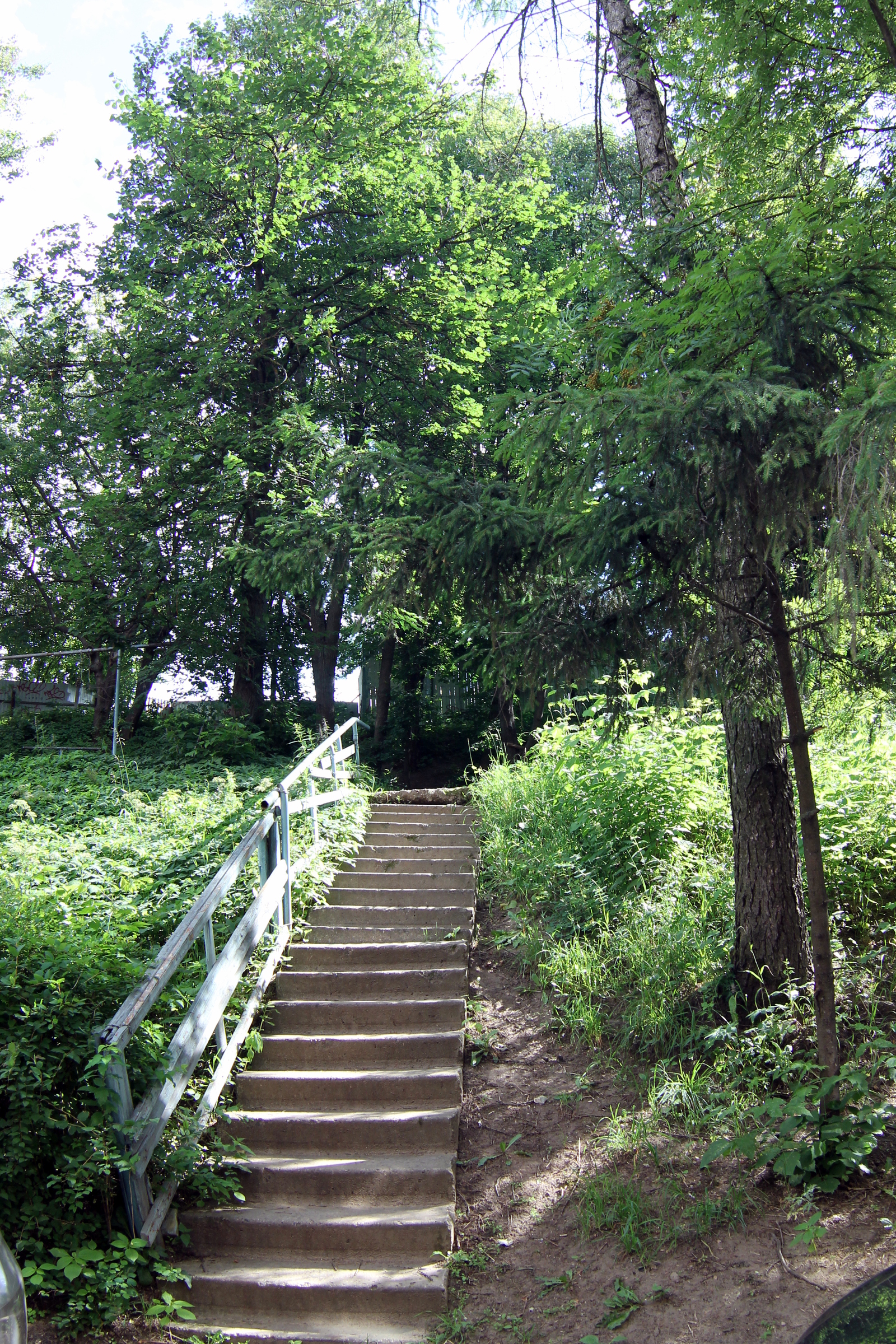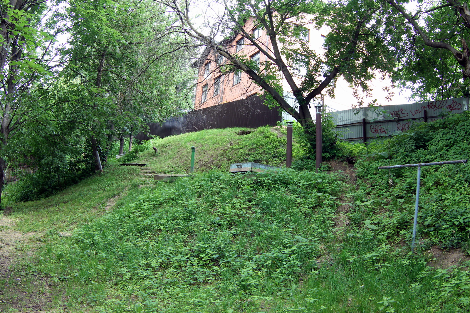 Обычный пятиэтажный дом, во дворе вдоль дома насыпь. Наверх вот такая лесенка.