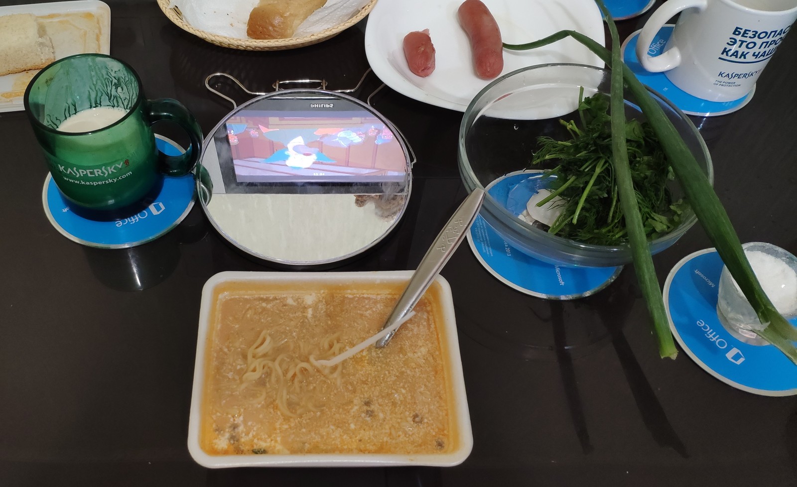 arbuzzz89 Удобно 6 лет назад Можно не поднимать голову поедая дошик. [моё] Зеркало Доширак Телевизор