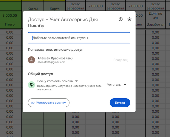 А теперь главная фишка - все критичные ячейки может менять только из-под аккаунта владельца файла, т.е. от имени вас. На этих ячейках стоит защита данных. Поэтому администраторы, работающие с табличкой не смогут нахимичить с формулами и что-то подправить в пользу себя, либо забрать деньги с кассы, выдать ЗП и т.п. Конечно, особо продвинутые и хитрые смогут это сделать через правку ячеек с расходами или запчастями и т.п., но это уже при желании можно будет отследить через историю изменений и особо хитрым надавать по заднице.