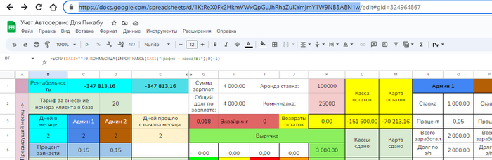 Кстати, ячейка H1 отображает общую сумму зарплат за месяц, а ячейка H2 - общий невыплаченный долг по зарплатам. Ячейка I3 позволяет проанализировать сколько у нас скушал банк за эквайринг при оплатах через терминал. И самое важное, ячейка L3 отображает текущий остаток налички в кассе, а ячейка M3 - остаток по карте. Так что если администратор внес все записи правильно и ничего не перепутал - наличка и остаток по карте будут сходиться копейка в копейку. Удобно для ежедневного контроля. Если вы хотите забрать часть денег из кассы или с карты, то просто в соответствующем зеленом столбце напротив нужного числа указываете данную сумму - она автоматически заминусуется из остатка по кассе. Чтобы положить деньги в кассу или на карту - запишите это число со знаком минус. Так как, надеюсь у вас бизнес процветает и забираете вы чаще, чем докладываете, то для простоты я сделал, что именно забор денег из кассы с плюсом идет. Пока не привыкнете - можно после записи контролировать актуальность остатка по кассе. Да, запись в эти столбцы может производить только владелец таблицы, т.е. вы. Все остальные аккаунты только могут просматривать содержимое. + вносить записи можно формулами. условно вы пришли в обед и забрали из кассы 10 тыс наличкой. записали в столбец с наличкой напротив соответствующего числа 10 тыс. а потом пришли вечером, вам налички еще навалило и вы забрали еще 50 тыс. чтобы не высчитывать это руками и не ошибиться - можно записать =10000+50000. Но это потом, с опытом.
