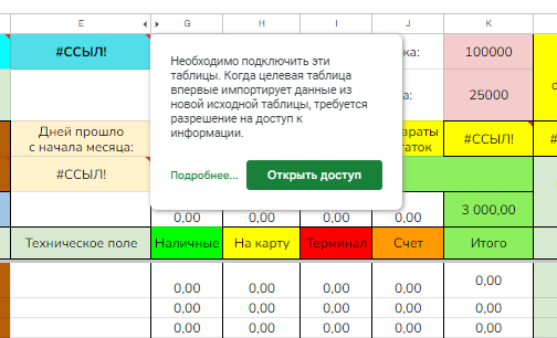 Ряд ячеек стали содержать значение "#ССЫЛ!". Это ошибка связана с тем, что вы пытаетесь подгрузить данные из другой таблицы (нашей же январской) в формулу, к которой надо дать разрешение, если вы обладаете соответствующими правами (а вы ими обычно обладаете). Чтобы дать права просто щелкаете мышкой на любую ячейку с ошибкой и жмакаете "Открыть доступ". Гугл немного думает, проверяет, что вы имеете доступ к той таблице и если все ОК - ошибка пропадает и таблица помимо расчетов внутри самой себя еще подтягивает данные из таблицы за предыдущий месяц. Теоретически длина подобной цепочки может быть безгранична, но я рекомендую не увлекаться и с начала следующего года начинать цепочку заново. У меня были случаи подглючивания, если цепочка оказывалась слишком длинной.