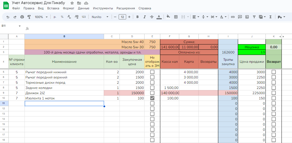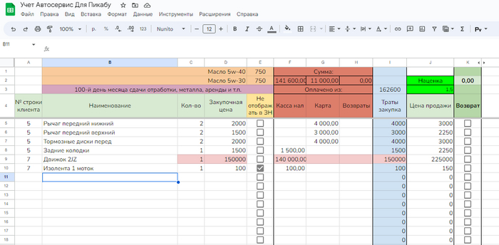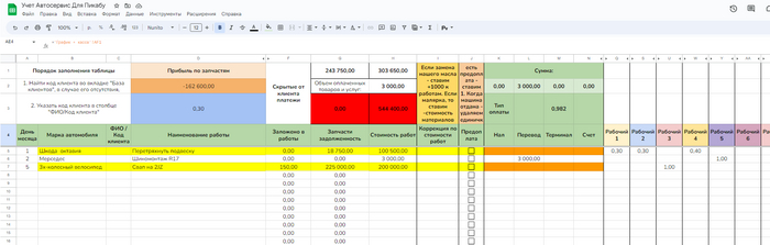 в колонке "День месяца" пишем текущее число. например, 1,2,3 и т.д. писать полностью дату не надо. Сделал сознательно для упрощения работы. Далее идет столбец ФИО/код клиента. Я клиентов вел в отдельной табличке и в этот столбец вписывал номер строки в своей базе с клиентом, чтобы не перегружать таблицу информацией. Либо оставлял ячейку пустой, если клиент залетный. Далее наименование работ. Вкратце или подробно расписываем, что делалось. Я всегда дрочил парней, чтобы расписывали по максимуму, чтобы если что - можно было найти, кто когда и чего делал. Далее у нас идет столбец "Скрытые от клиента платежи" этот столбец может редактировать только владелец файла. Поэтому даже если вы работаете один без администраторов - рекомендую завести отдельно рабочий аккаунт и работать и-под него, чтобы случайно чего не сломать пока осваиваетесь в таблице. В той ячейке формула, которая подтягивает записи из соседней вкладки с запчастями, напротив которых стоит галочка "Не отображать в заказ-наряде". Делал это на случай, если есть какие-то расходы, которые нужно учесть, но при этом клиент не должен видеть их в генерируемом ЗН. Далее столбец с суммарной задолженностью по запчастям, которая аналогично подтягивается из вкладки запчастей, суммируя все закупленные запчасти по данному авто. Далее мы уже собственными руками вписываем стоимость работ.