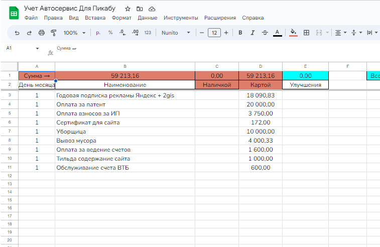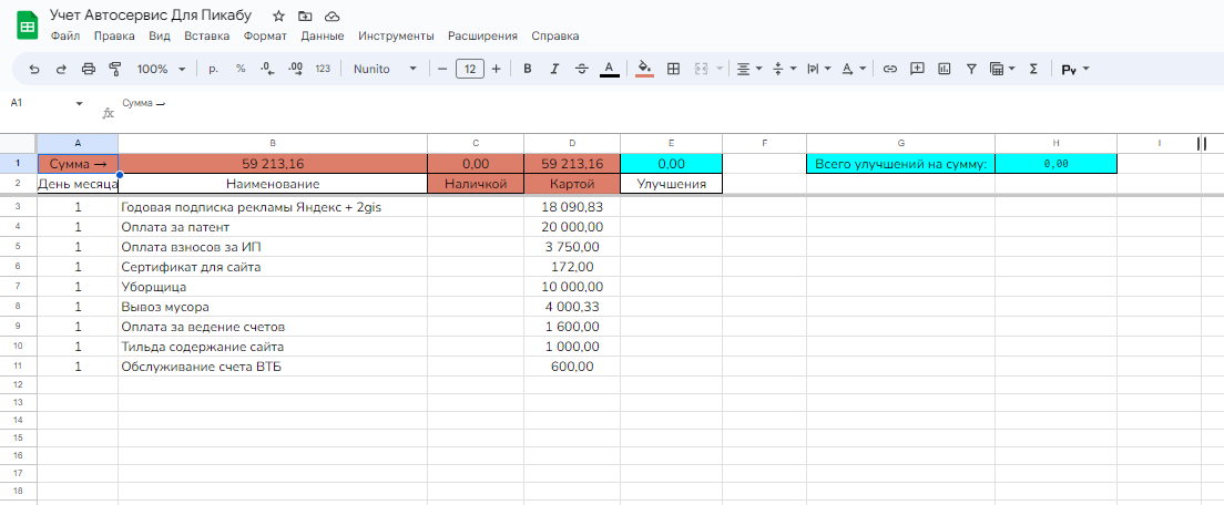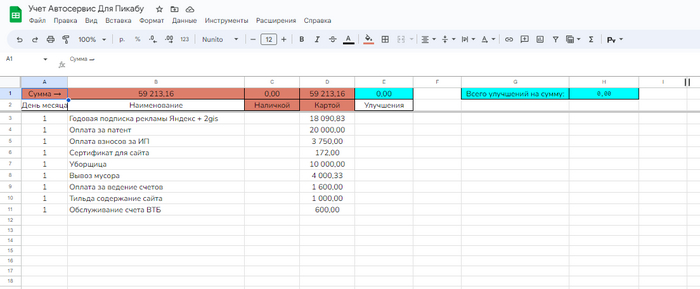 Вкладка "Расходы" особо не нуждается в пояснениях. Здесь мы в столбце C указываем расходы, проплаченные наличкой. в столбце D - с банковской карты. В столбце E я для себя отмечал закупку оборудования и цену всяческих улучшений сервиса. Чтобы потом понимать, сколько стоит мой бизнес. сколько денег я в него влил, именно в постройку. Сумма по улучшениям с учетом цепочки из предыдущих таблиц будет в ячейке H1.