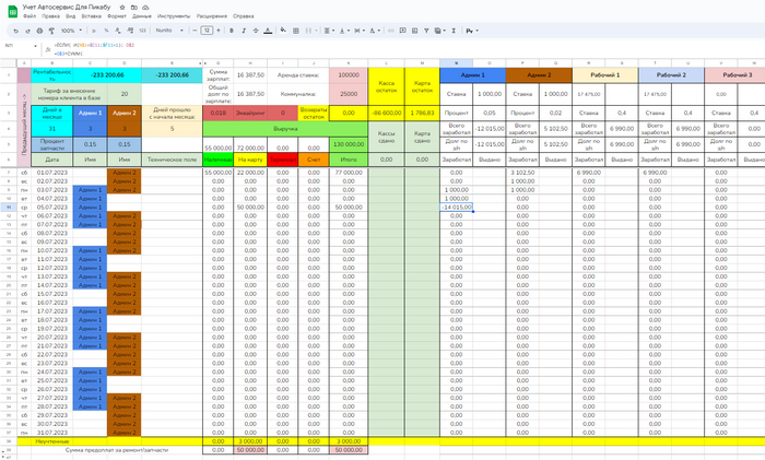 Я сейчас специально в одной из строк с оплаченными работами удалил число и мы видим внизу подсвеченую желтую строку с неучтенными деньгами. Напротив другой из работ я поставил галочку предоплаты и мы внизу также видим общую сумму предоплат. Далее видим, что за 5е число у нас на карту упало 50 тыс и общая выручка за 5е число составила 50 тыс. А также видим, что у первого администратора минус в зарплате. а это потому что этот засранец не взял предоплату за запчасти. Как только он это сделает - справедливость будет восстановлена. так же я проставил частичную проплату за авто, принятого 1го числа (видите, да, что в соответствующей графе таблица автоматом подтянула суммарный платеж в 77 тыс?) и работягам сразу посчиталась зарплата в соответствии с их процентовкой. Причем она посчиталась с учетом того, что часть из этого платежа ушла на полную оплату запчастей. И в соответствующих ячейках под именами работяг мы видим, кому и сколько мы суммарно должны зарплат.