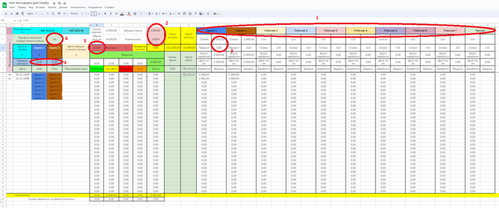 В обведенном овале с циферкой 1. Вписываем имена администраторов и рабочих. Последнюю колонку с названием "Прочие" рекомендую оставить как есть - туда я обычно записывал работы, которые делал сам, или которые делали подрядчики. Если столько людей нет, то часть колонок можно не заполнять или оставить пустыми. Не на что не влияет - просто для удобства. Под колонками с именами рабочих есть ячейка "Ставка" и рядом значение. Это процент, который рабочий получает с работ. (0,4 = 40%, 0,5 = 50% и т.д.). Обратите внимание, что Google-таблицы в качестве разделителя принимают только запятую. Если вы дробные значения будете разделять точками - то будете получать сообщения об ошибках в формулах. Это касается работы со всей таблицей. Но дело привычки.