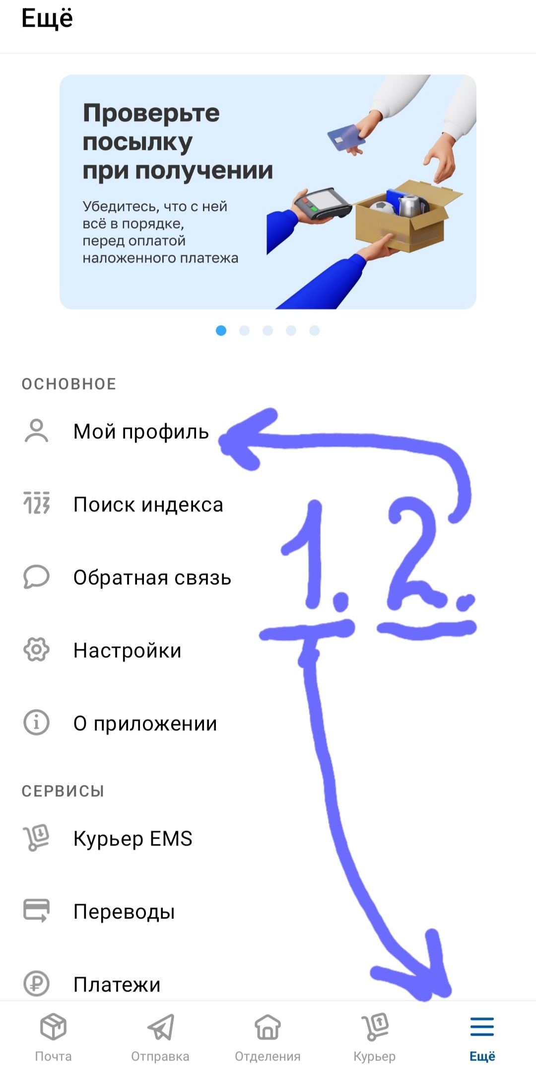 Итак первое, запускаем приложение Почты России и идём в пункт "Ещё", этот пункт меню находится внизу, далее выбираем "Мой профиль".