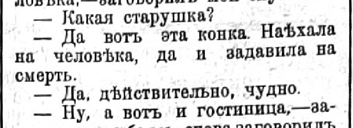 — Чудно, ей Богу чудно, как это такая старушка могла задавить человека, — заговорил мой спутник.