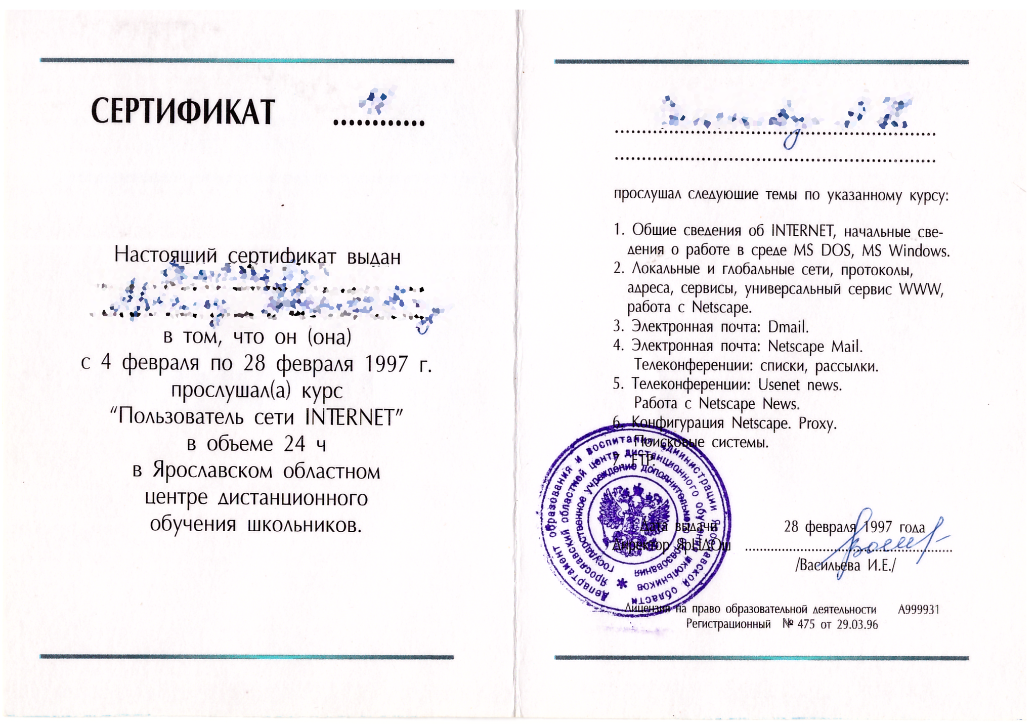 Удостоверение на право управления ПК в сети INTERNET образца 1997 года