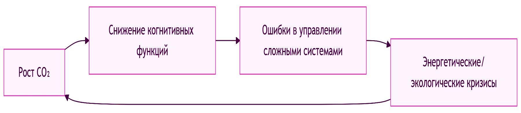 Снижение способности к стратегическому мышлению на 25%; Рост ошибок в управлении сложными системами (пример: аварии на производствах при 1200 ppm)